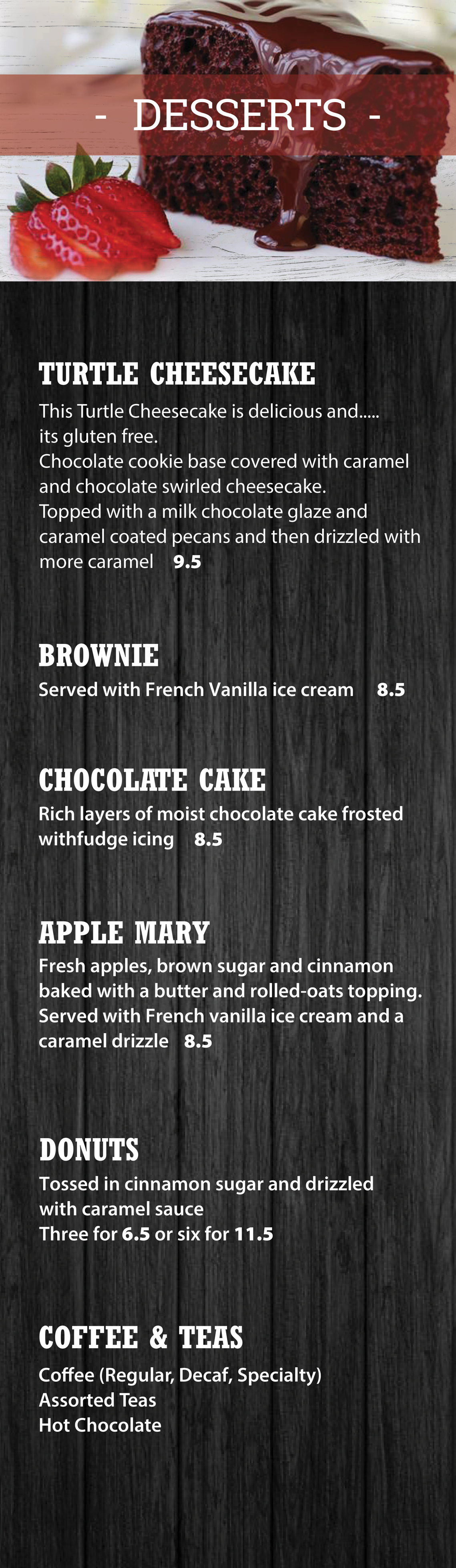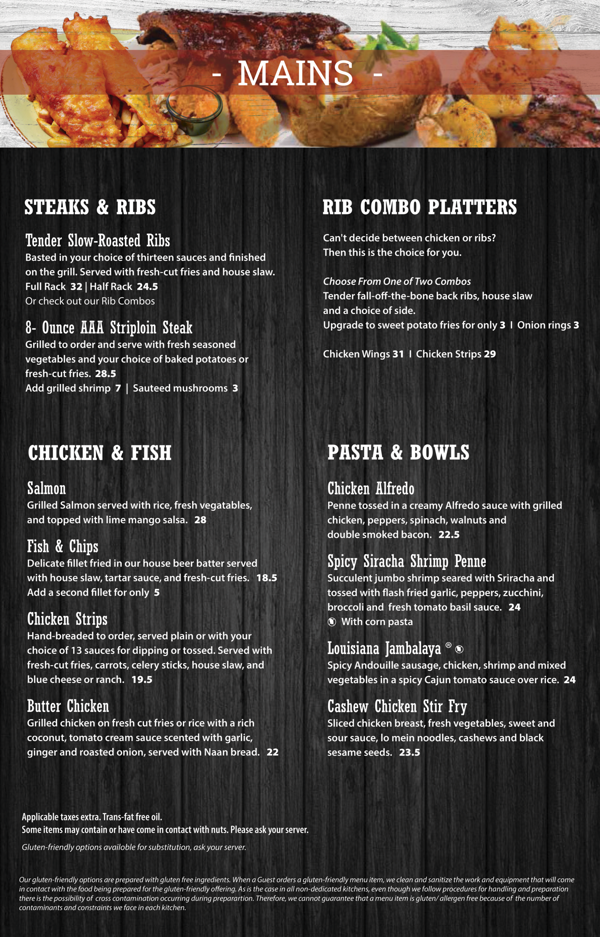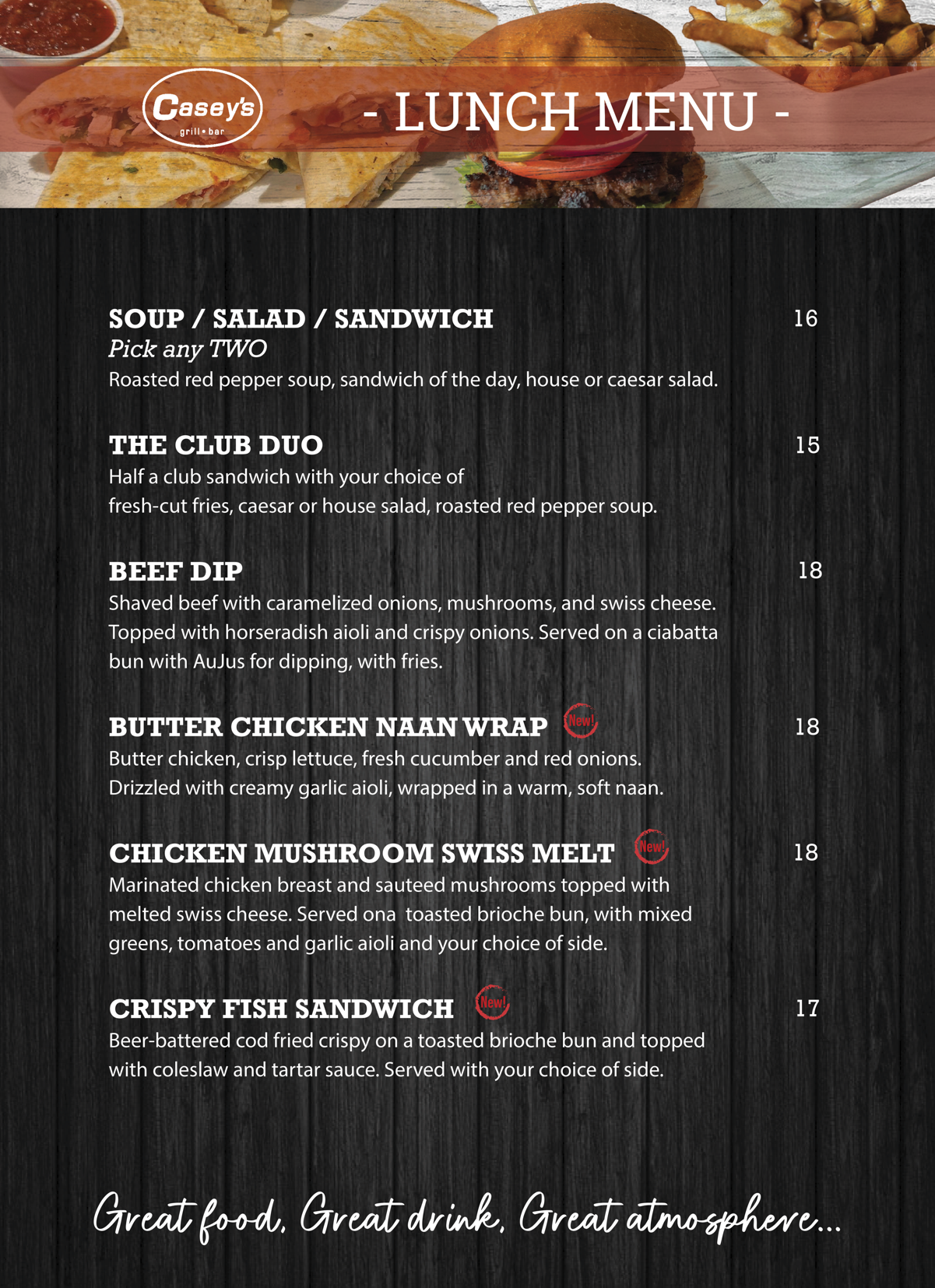 MENU JUMP TO STARTERS / MAINS / LUNCH / DESSERT / KIDS / BEVERAGES Applicable taxes extra.“Casey’s Kitchener” fries in trans-fat free oil. Some items may contain or have come in contact with nuts. Please ask your server.* Gluten-friendly bun available for substitution, please ask your server. ORDER NOW Contact (519) 745-6125 caseys@caseyskitchener.ca Address 1120 Victoria St N, Kitchener, ON N2B 3T2